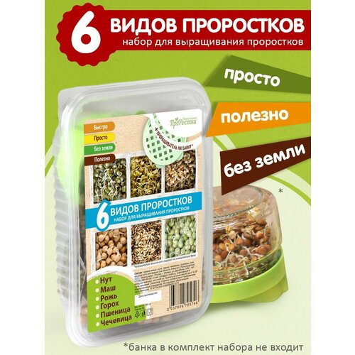 Набор для проращивания (на проростки) 6 видов: маш, нут, горох, чечевица, пшеница, рожь