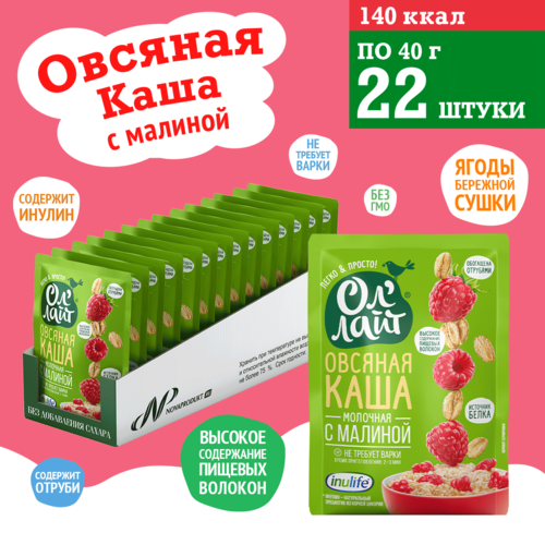 Овсяная молочная каша быстрого приготовления "Ол’Лайт" с малиной в пакетиках ,22 шт. по 40г.