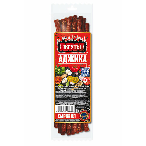 Колбаски "Жгуты с Аджикой", кнутики сырокопченые, снек к пиву и не толькои з мяса птицы, 80 гр. пивчики сыровял 180