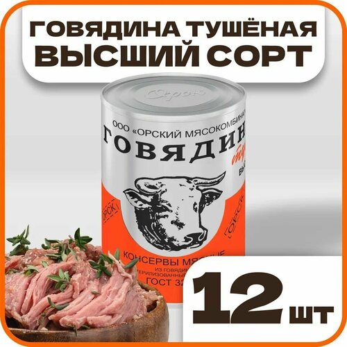 Говядина тушеная высший сорт ГОСТ, в наборе 12 шт по 338гр, Орский мясокомбинат