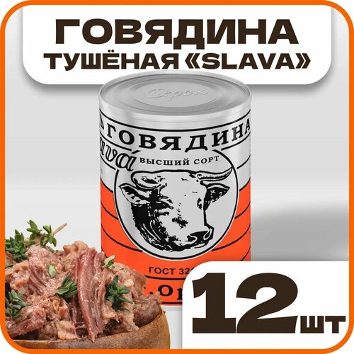 Говядина тушеная высший сорт "Слава" ГОСТ, в наборе 12 шт по 338гр, Орский мясокомбинат