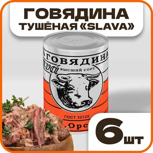 Говядина тушеная высший сорт "Слава" ГОСТ, в наборе 6 шт по 338гр, Орский мясокомбинат