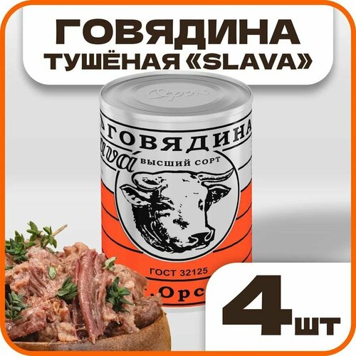 Говядина тушеная высший сорт "Слава" ГОСТ, в наборе 4 шт по 338гр, Орский мясокомбинат