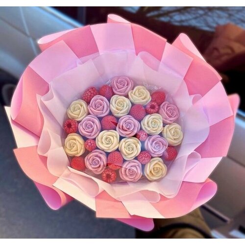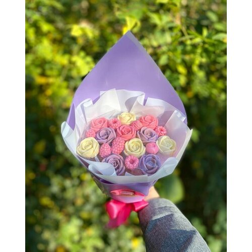 Букет из шоколадных роз "ShokoTrendy", с шоколадными ягодами малины, белый шоколад, 180г