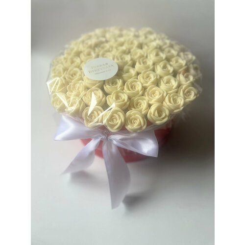 Букет из шоколадных роз "ShokoTendry", в шляпной коробке, 51 белая шоколадная роза, 612 г