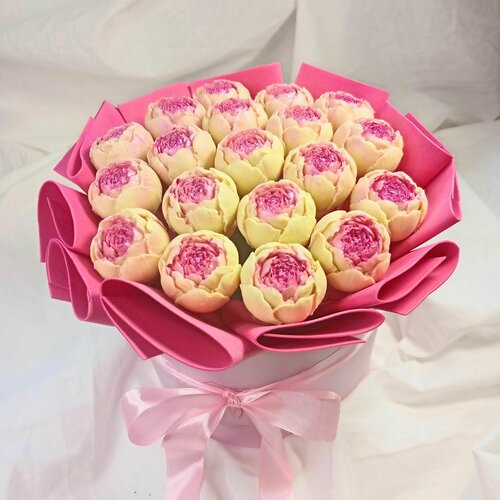Шоколадный букет "Пионы" в шляпной коробке от Первой Букетной, ванильный аромат, ручная работа, 19 штук
