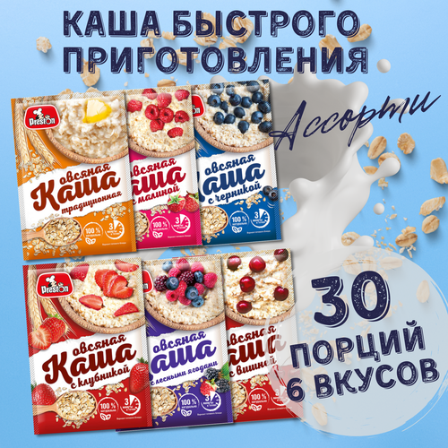 Каша овсяная быстрого приготовления Preston, в пакетиках 37 г, Ассорти 6 вкусов, 30 шт.