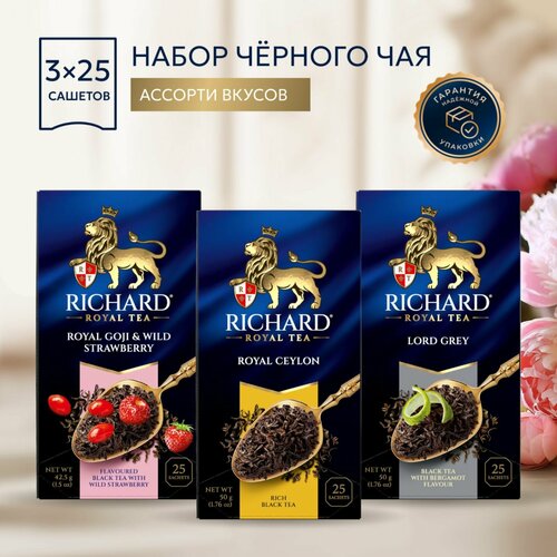 Чай Richard Royal Ceylon, Lord Grey, Goji & Wild Strawberry, набор ассорти 3 уп х25 пак