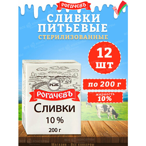 Сливки питьевые стерилизованное, 10%, Рогачев, 12 шт. по 200 г
