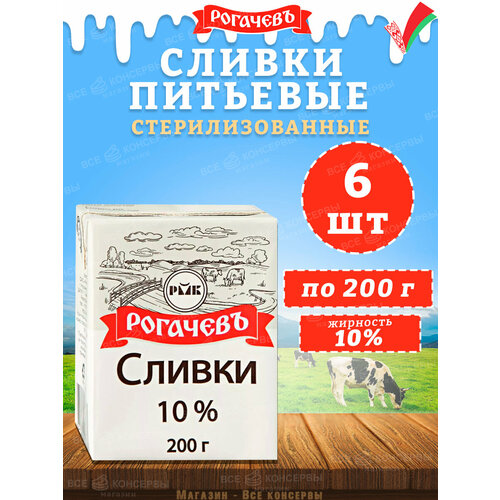 Сливки питьевые стерилизованное, 10%, Рогачев, 6 шт. по 200 г