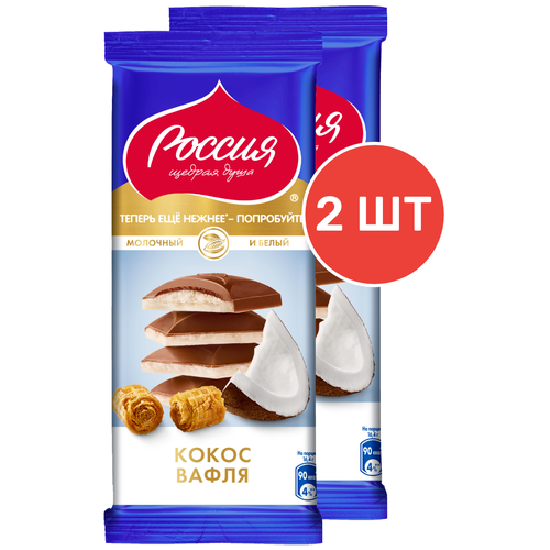 Плиточный шоколад, "Россия — Щедрая Душа", молочный шоколад с белым, с кокосовой стружкой и вафлей, 82г 2 шт