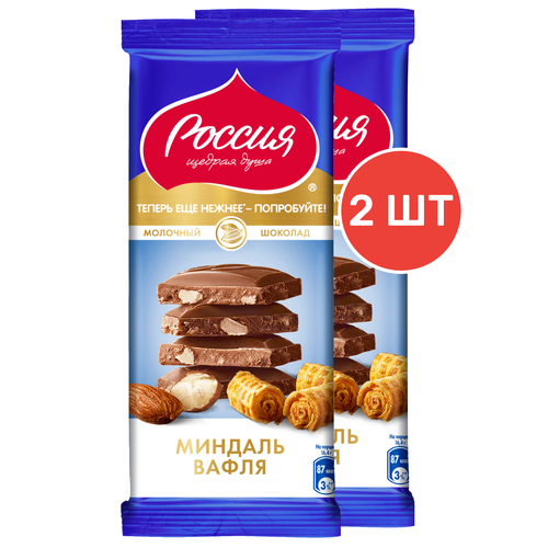 Плиточный шоколад, "Россия — Щедрая душа!", молочный, с миндалем и вафлей, 82г 2 шт