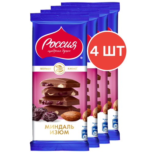 Плиточный шоколад, "Россия — Щедрая душа!", молочный, с миндалем и изюмом, 82г 4 шт