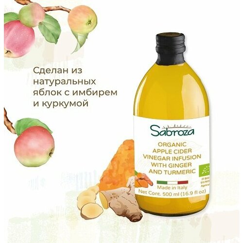 Sabroza Уксус яблочный органический, с имбирем и куркумой, непастеризованный, нефильтрованный. 500 мл. Стекло