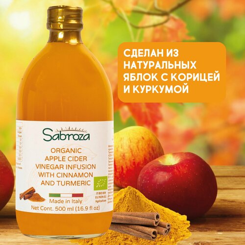 Sabroza Уксус яблочный органический, с корицей и куркумой, непастеризованный, нефильтрованный. 500 мл. Стекло