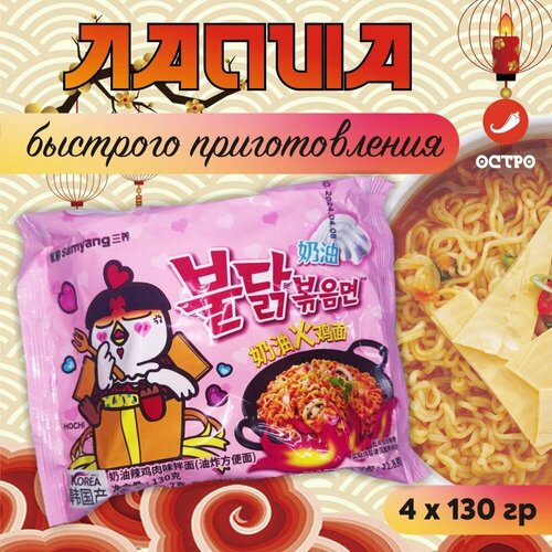 Корейская Острая лапша быстрого приготовления со вкусом курицы с соусом Карбонара / SAMYANG HOT CHICKEN FLAVOR RAMEN CARBO4шт/ Розовая
