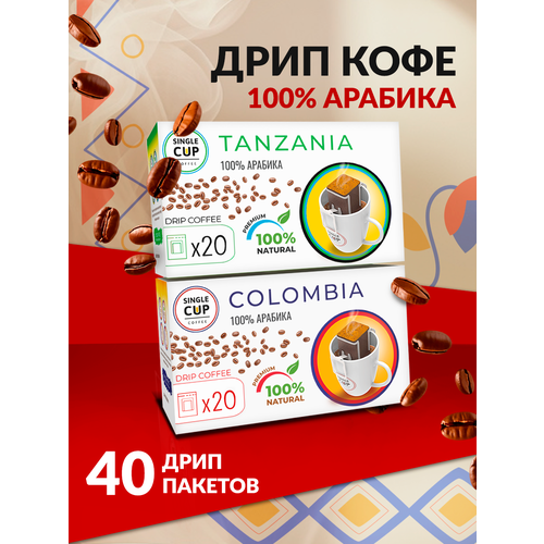 Набор молотого кофе в дрип-пакетах "SINGLE CUP COLOMBIA, TANZANIA", 40 шт