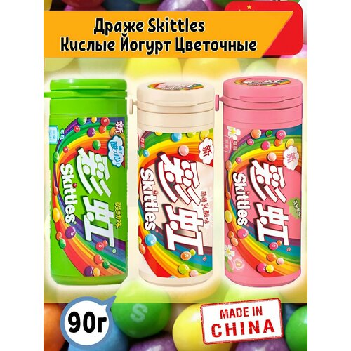 Жевательные конфеты Skittles Скитлс Фруктовый микс йогурт, Цветочные, Кислые, 3 баночки по 30 гр, Китай.