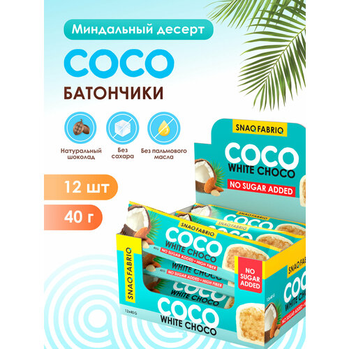 Кокосовые батончики Snaq Fabriq COCO в белом шоколаде без сахара "Миндаль — Кокос", 12шт х 40г