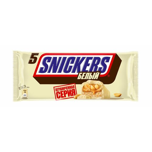 Шоколадные батончики Snickers Белый, 5 шт по 40.5 г, Белый шоколад, нуга, карамель, арахис, шоколад