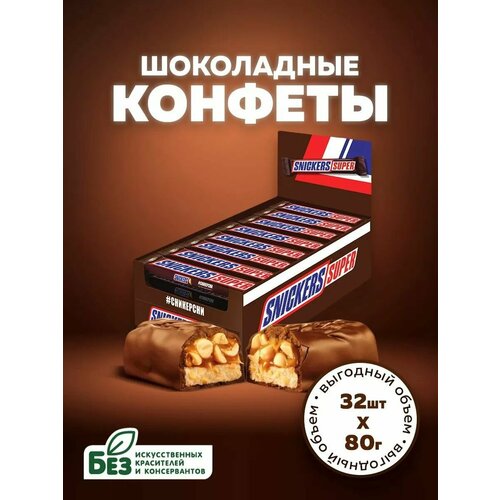 Шоколадные батончики Snickers Super с карамелью, арахисом и нугой, 32 шт по 80 г