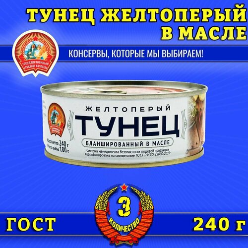 Тунец желтоперый бланшированный в масле ГОСТ Сохраним традиции, 3 шт по 240 г
