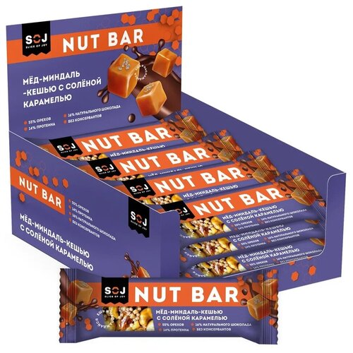 Ореховый батончик SOJ NUT BAR мёд миндаль кешью с соленой карамелью в молочном Бельгийском шоколаде (40гр * 16 шт в наборе)