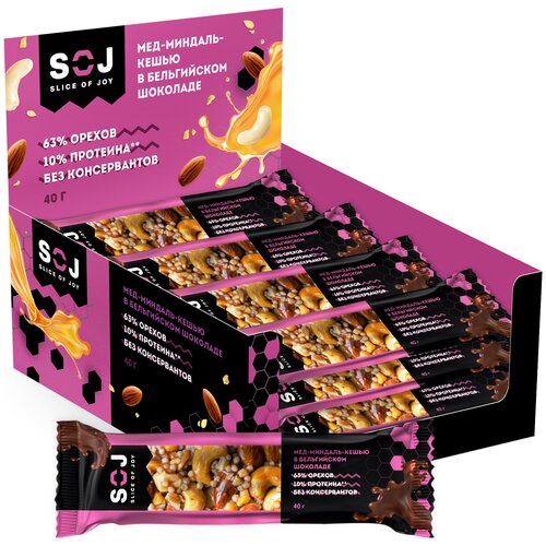 Ореховый батончик SOJ с мёд миндаль кешью с ирисо-сливочным вкусом в молочном Бельгийском шоколаде (40г х 20шт)