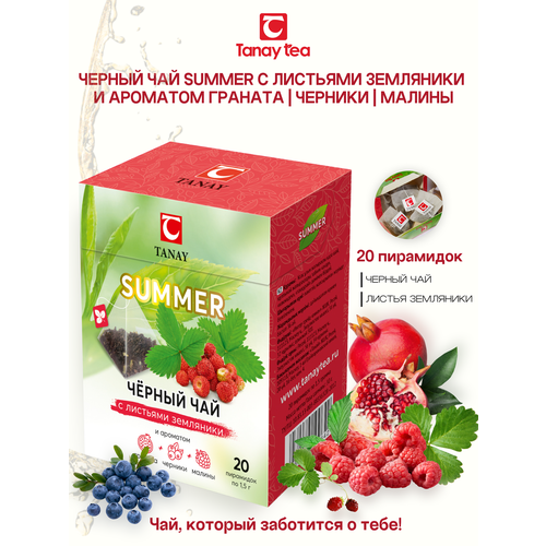 Чай чёрный байховый мелколистовой Tanay "SUMMER" с листьями земляники в пирамидках 20*1,5гр. с/я.