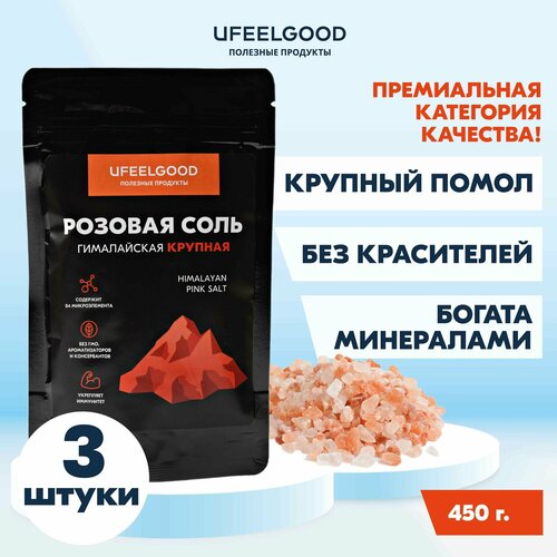 Гималайская розовая соль, крупная, специя без вкусовых добавок и красителей, UFEELGOOD 450 г. х 3 шт