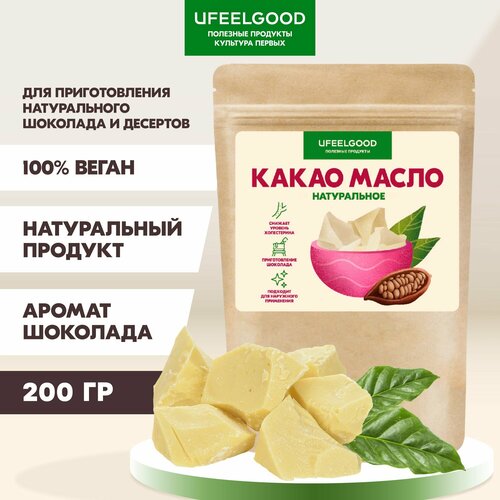 Какао-масло натуральное нерафинированное, растительное пищевое для шоколада, для выпечки, веган, UFEELGOOD 200 г.