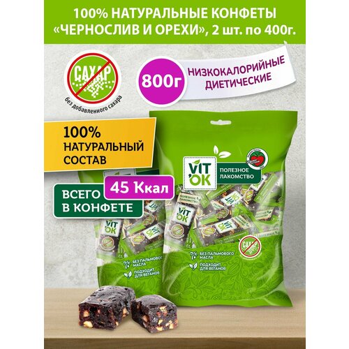 Конфета-батончик Vitok 100% натуральная полезная без сахара Чернослив и орехи, 2 шт по 400 г