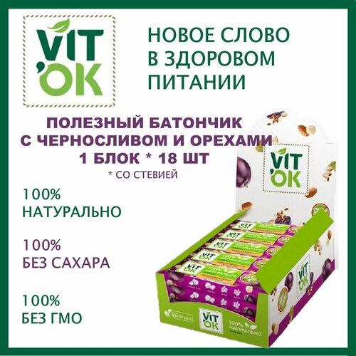 Батончик VITok с черносливом и орехами без сахара неглазированный для здорового питания 1 блок*18шт/Московская ореховая компания/Россия