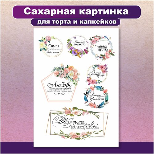 Сахарная картинка для торта и капкейков изображены цветы поздравление "С днем рождения. Юбилей". Украшение и декор торта выпечки. Сахарная бумага А4 / Вкусняшки от Машки