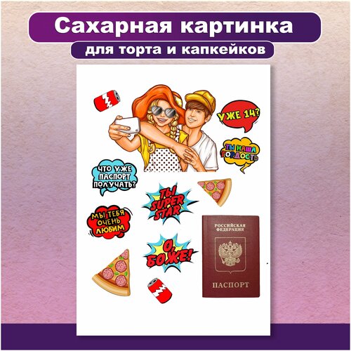 Сахарная картинка для торта и капкейков изображен паспорт в 14 лет / подарок в день рождения / Украшение и декор торта выпечки. Сахарная бумага А4 / Вкусняшки от Машки