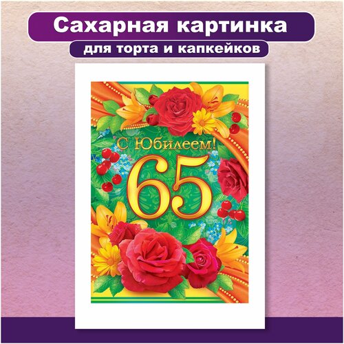 Сахарная картинка для торта и капкейков изображены поздравления "С днем рождения 65 лет юбилей". Украшение и декор торта выпечки. Сахарная бумага А4 / Вкусняшки от Машки