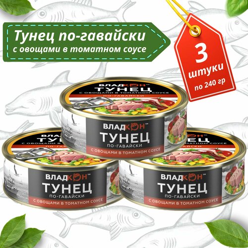 Тунец желтоперый в томатном соусе с овощами по-гавайски Владкон рыбные консервы 240г х 3 штуки