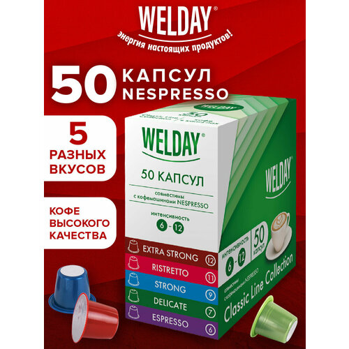 Кофе в капсулах для кофемашины Nespresso, 50 порций, 5 вкусов, Welday Classic Line Collection, 623746