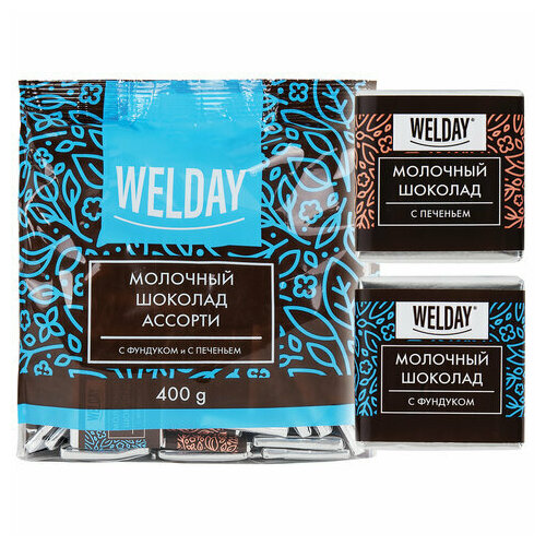 Шоколад порционный набор мини шоколадки с фундуком и печеньем, молочный 27%, 400 г (80 плиток по 5 г), Welday (вэлдэй), 622408
