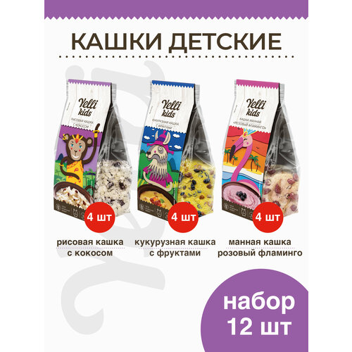 Детские каши Yelli kids 12 шт. (Рисовая с кокосом 4*100г, Кукурузная с фруктами 4*120г, Манная Розовый фламинго 4*100г)