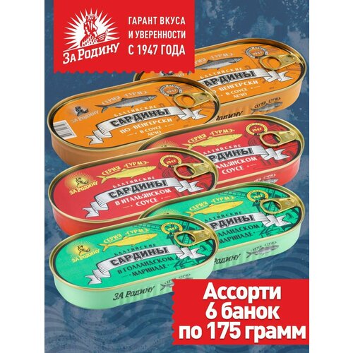 Сардина балтийская За Родину аcсорти — 3 вкуса, 6 банок 175 г с ключом.