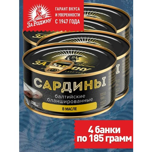 Сардины балтийские бланшированные в масле За Родину, 4 банки по 185 грамм