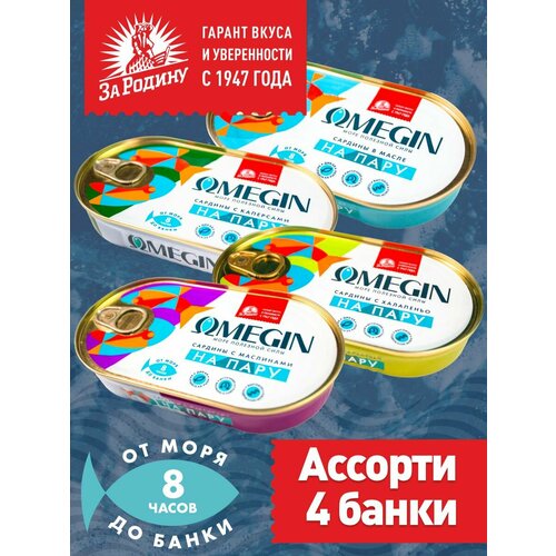 Сардины балтийские на пару ассорти 4 вкуса, За Родину OMEGIN, 4 банки по 175 грамм