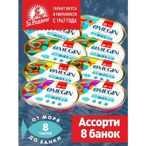 Сардины балтийские на пару 4 вкуса, За Родину OMEGIN, 8 банок по 175 грамм