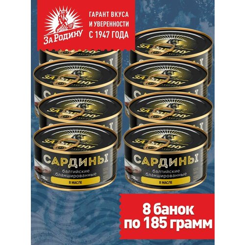 Сардины балтийские бланшированные в масле За Родину, 8 банок по 185 грамм