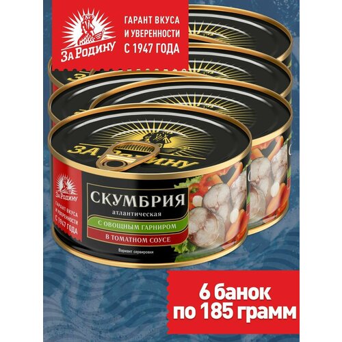 Скумбрия атлантическая с овощным гарниром в томатном соусе За Родину, 6 банок по 185 грамм