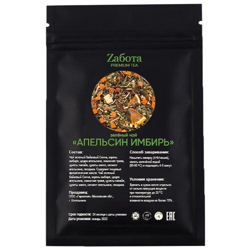 Чай листовой Premium, зеленый чай Апельсин и имбирь, рассыпной, Zабота, чай для похудения в подарочной упаковке