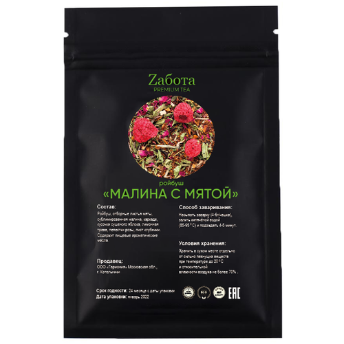 Premium чай ройбуш Малина и мята, красный фиточай листовой, Zабота, рассыпной, чайный травяной напиток, подарок женщине, мужчине 100 гр.