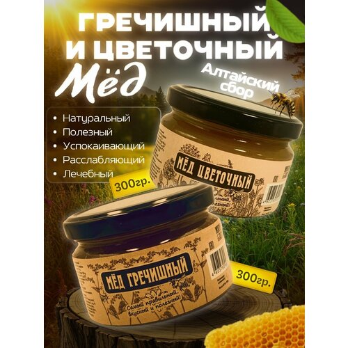 Мёд Гречишный "Жизнь Алтая" 300гр+Мёд Цветочный, "Жизнь Алтая" 300гр. Год сбора:2024г .(2*300 гр)