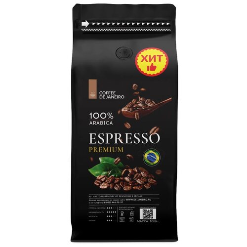De Janeiro Espresso Premium — настоящий кофе из Бразилии в зёрнах. Сул Де Минас 100% арабика. Самый известный в мире сорт бразильской арабики. Считается мировым эталоном кофейного качества. Идеально подходит для приготовления бодрящего утреннего эспрессо. Отличается насыщенным, ароматным вкусом и густой пенкой. Для того, чтобы максимально сохранить вкус и аромат свежеобжаренного кофе, применяется упаковка с замком Zip-Lock (многократное открытие и закрытие, для увеличения срока хранения). Его нужно открыть, потянув за специальный ключик-замок, он находится на лицевой стороне, над воздушным клапаном. А для максимальной защиты в процессе транспортировки, кофе упаковывается в дополнительную плёнку толщиной 100 микрон. Производство сертифицировано по мировому стандарту ХАССП и работает под контролем дипломированных специалистов.